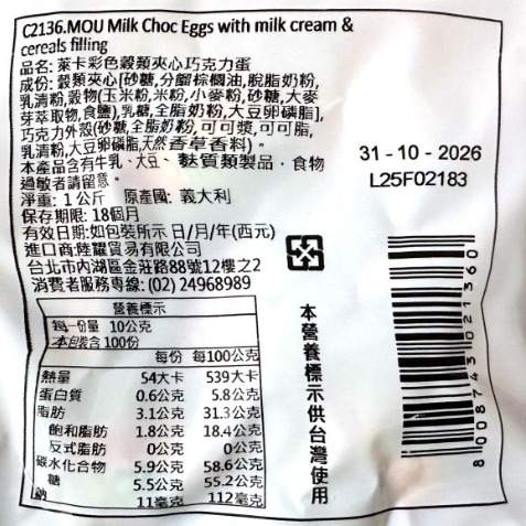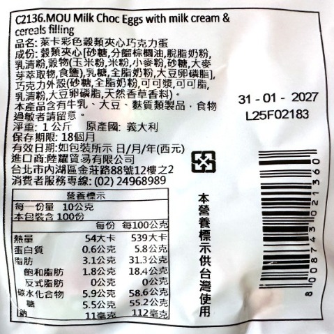 品名: Laica萊卡彩色穀類夾心巧克力蛋 條碼: 8008743021360 貨號: L2136 成份: 穀類夾心[砂糖,分餾棕櫚油,脫脂奶粉,乳清粉,穀物(玉米粉,米粉,小麥粉,砂糖,大麥芽萃取物,食鹽),乳糖,全脂奶粉,大豆卵磷脂],