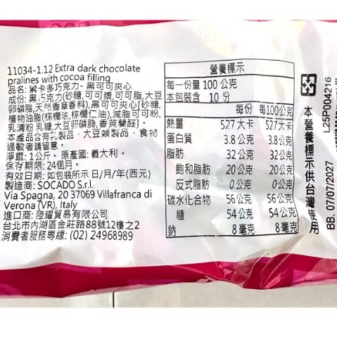 本產品含有乳製品、大豆類製品,食物過敏者請留意。淨重: 1kg 原產國: 義大利 有效日期: 如包裝所示 日/月/年(西元) 保存期限: 24個月 製造商: SOCADO SRL 進口商: 陸耀貿易有限公司