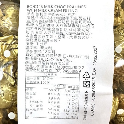 本產品含有牛奶、堅果、大豆類製品,食物過敏者請留意。淨重: 1kg 原產國: 義大利 有效日期: 如包裝所示 日/月/年(西元) 保存期限: 18個月 製造商: DULCIOLIVA SRL 進口商: 陸耀貿易有限公司
