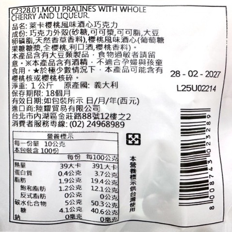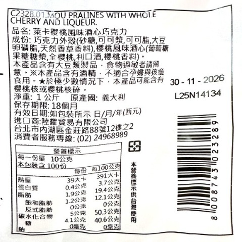 品名: Laica萊卡櫻桃風味酒心巧克力 條碼: 8008743023289 貨號: L2328 成份: 巧克力外殼(砂糖,可可塊,可可脂,大豆卵磷脂,天然香草香料),