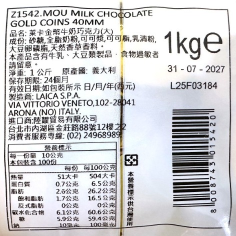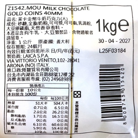 品名: Laica萊卡金幣牛奶巧克力(大) 條碼: 8008743015420 貨號: L1542 成份: 砂糖,全脂奶粉,可可漿,可可脂,乳清粉,大豆卵磷脂,天然香草香料。