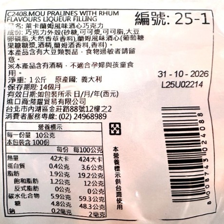 品名: Laica萊卡蘭姆風味酒心巧克力 條碼: 8008743024088 貨號: L2408 成份: 巧克力外殼(砂糖,可可漿,可可脂,大豆卵磷脂,天然香草香料),