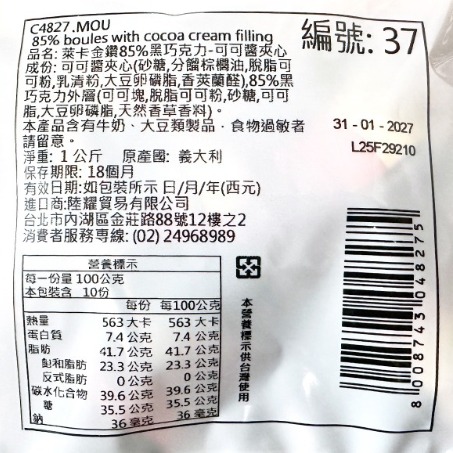 85%黑巧克力外層(可可塊,脫脂可可粉,砂糖,可可脂,大豆卵磷脂,天然香草香料)。