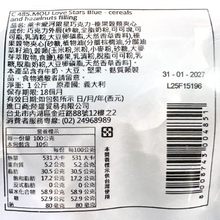 品名: Laica萊卡愛河銀星巧克力-榛果穀類夾心 條碼: 8008743004851 貨號: C485 成份: 巧克力外層(砂糖,全脂奶粉,可可塊,可可脂,乳清粉,大豆卵磷脂,天然香草香料),