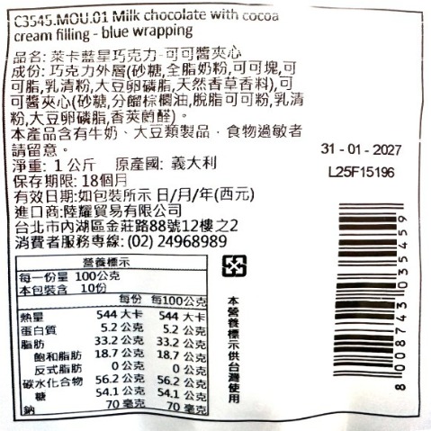 品名: Laica萊卡藍星巧克力-可可醬夾心 條碼: 8008743035459 貨號: C3545 成份: 巧克力外層(砂糖,全脂奶粉,可可塊,可可脂,乳清粉,大豆卵磷脂,天然香草香料),