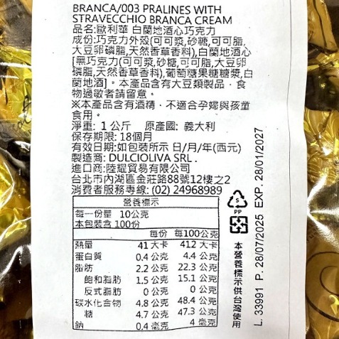 品名: 歐利華白蘭地酒夾心巧克力 條碼: 8008342003972 貨號: OL031 成份: 成份:巧克力(可可漿.砂糖.可可脂.大豆卵磷脂.天然香草香料).葡萄糖果糖糖漿.白蘭地酒。