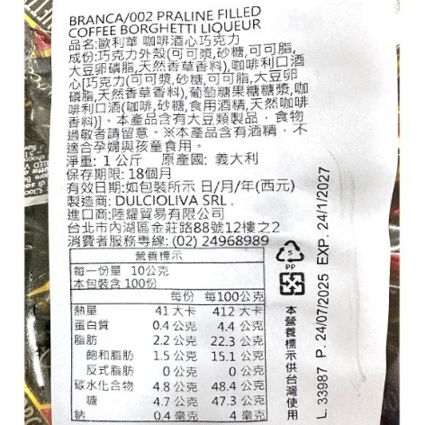 品名: 歐利華咖啡酒口味夾心巧克力 條碼: 80083420053965 貨號: OL030 成份: 成份:巧克力(可可漿.砂糖.可可脂.大豆卵磷脂.天然香草香料).