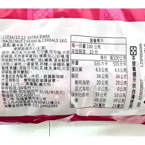品名: 索卡多巧克力-榛果穀類夾心(紅黑) 條碼: 8000017110343 貨號: S602 成份: 成份:黑巧克力(砂糖.可可漿.可可脂.大豆卵磷脂.天然香草香料).