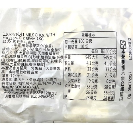 品名: 索卡多巧克力-牛奶風味榛果夾心(金黑) 條碼: 8000017110343 貨號: S618 成份: 成份:牛奶巧克力(砂糖.可可脂.全脂奶粉.可可漿.大豆卵磷脂.天然香草香料).