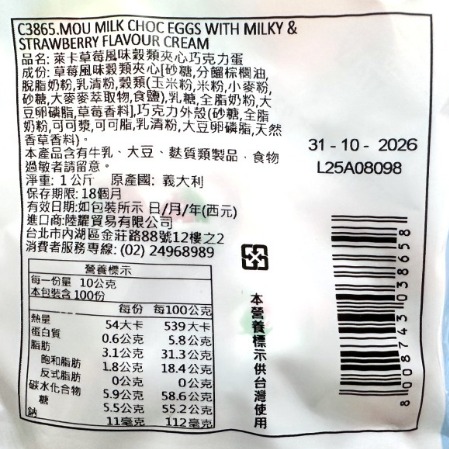 品名: 萊卡草莓風味穀類夾心巧克力蛋 條碼: 8008743038658 貨號: L3865 成份: 草莓風味穀類夾心[砂糖,分餾棕櫚油,脫脂奶粉,乳清粉,穀類(玉米粉,米粉,小麥粉,砂糖,大麥麥萃取物,食鹽),乳糖,全脂奶粉,大豆卵磷脂,草莓香料],